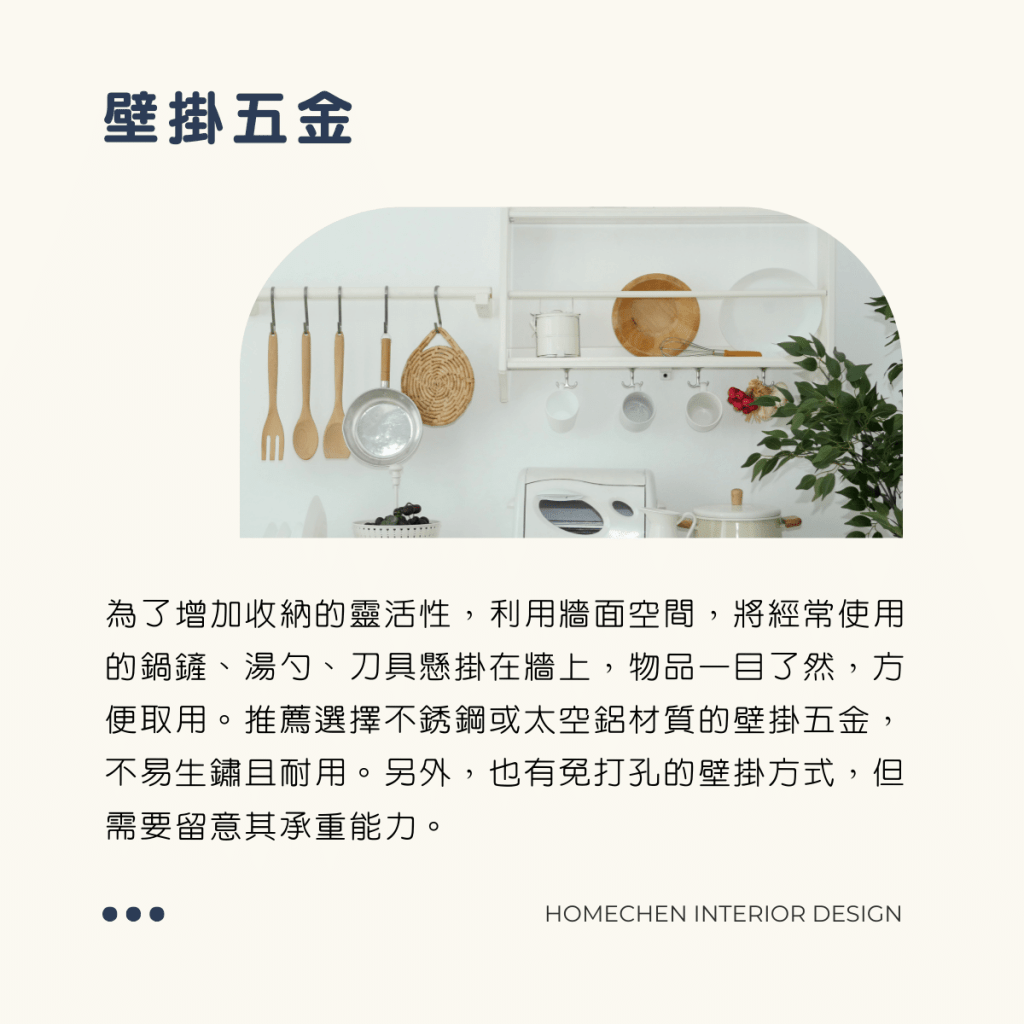 為了增加收納的靈活性,利用牆面空間,將經常使用的鍋鏟、湯勺、刀具懸掛在牆上,物品一目了然,方便取用。推薦選擇不銹鋼或太空鋁材質的壁掛五金,不易生鏽且耐用。另外,也有免打孔的壁掛方式,但需要留意其承重能力。