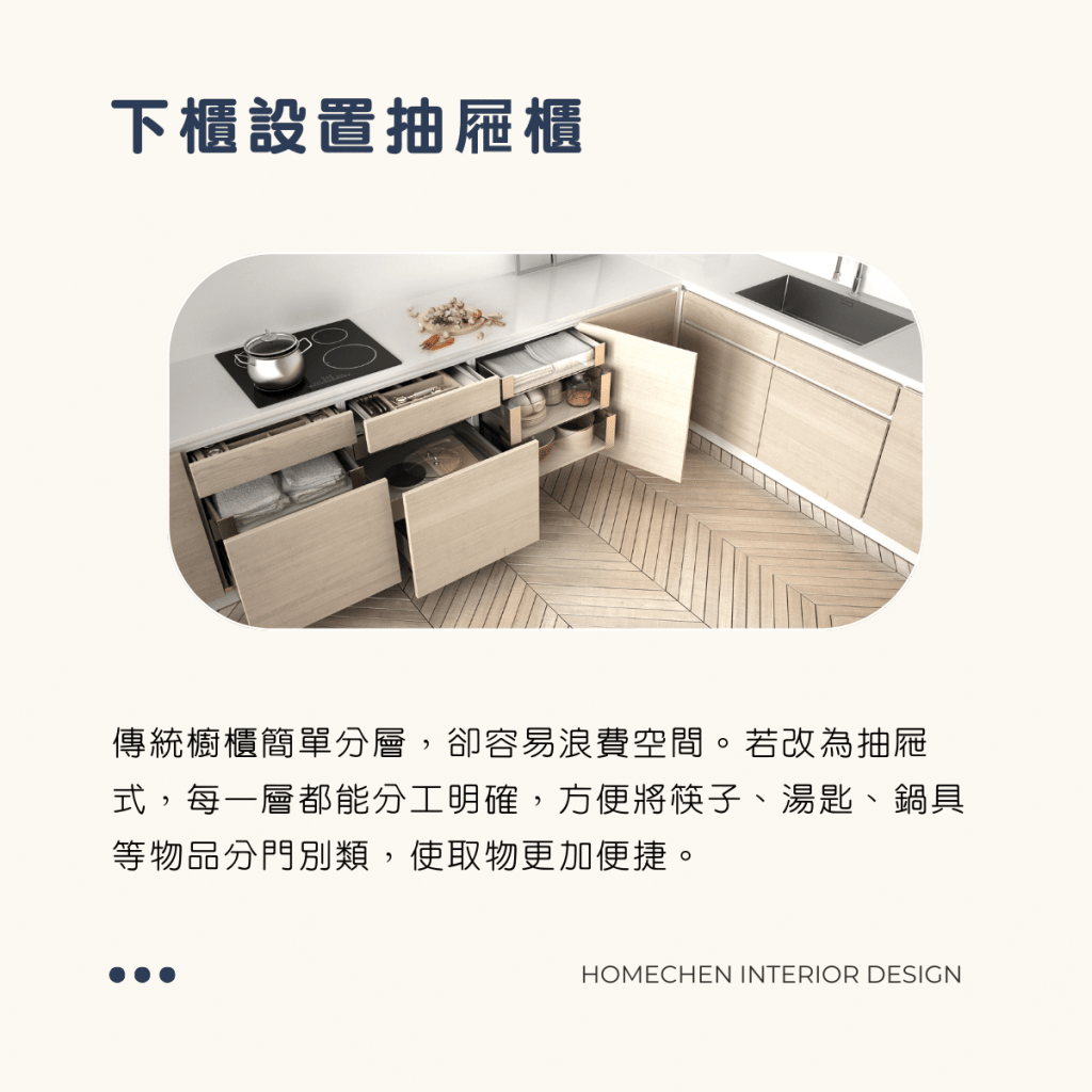 傳統櫥櫃簡單分層,卻容易浪費空間。若改為抽屜式,每一層都能分工明確,方便將筷子、湯匙、鍋具等物品分門別類,使取物更加便捷。