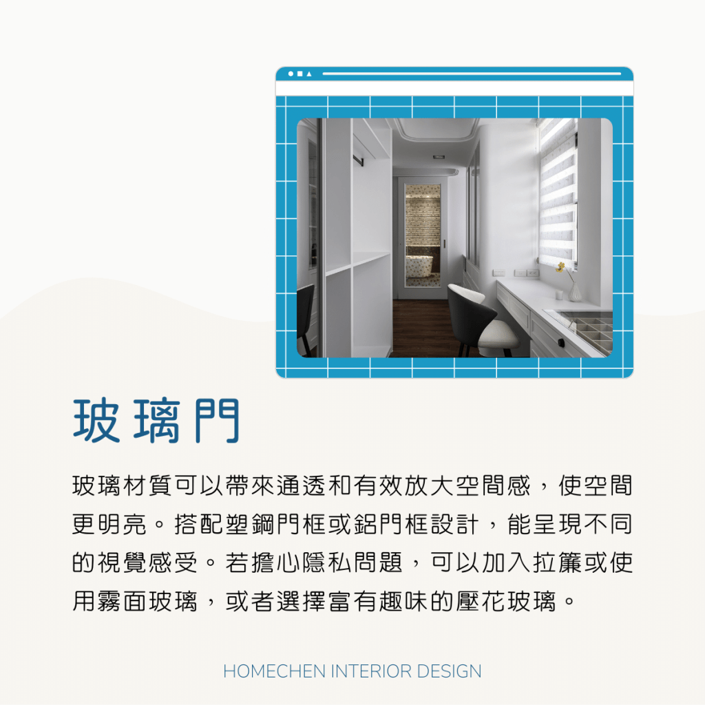 玻璃材質可以帶來通透和有效放大空間感,使空間更明亮。搭配塑鋼門框或鋁門框設計,能呈現不同的視覺感受。若擔心隱私問題,可以加入拉簾或使用霧面玻璃,或者選擇富有趣味的壓花玻璃。