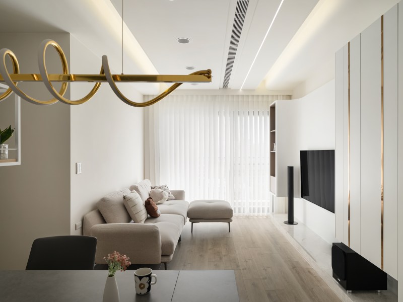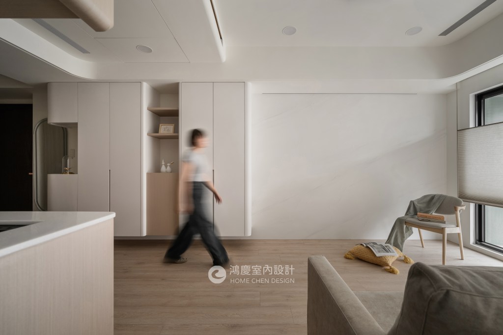 空間,應該是溫暖而包容的。以 白色 為基調,展現純粹簡約的視覺美感,搭配 橡木木紋,為居家注入溫潤自然的氛圍。大面積的 圓弧造型櫃體與天花設計,柔化了直線帶來的鋭利感,使整體空間更顯流暢且富有層次,營造出細膩且富有溫度的居住體驗。