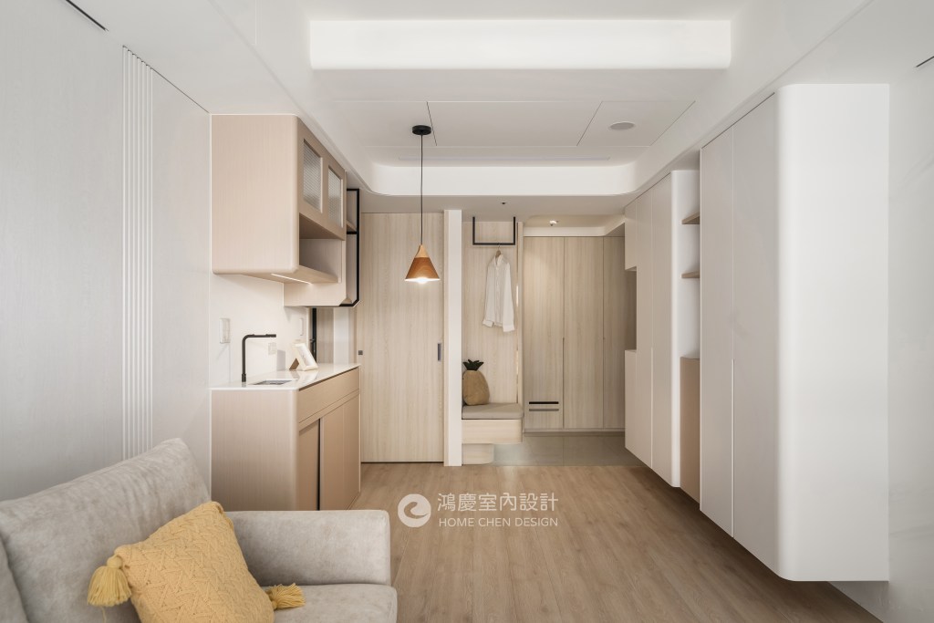 由於室內空間較小,所以設置一個天花板收納櫃,能作為額外的收納空間,天花板收納櫃的設計不僅實現了功能上的高效收納,還能保持空間的整潔與視覺上的簡約感。適用於各種現代家居,特別是對於需要最大化空間利用的小戶型或高需求的儲物需求空間,提供了一個理想的解決方案。