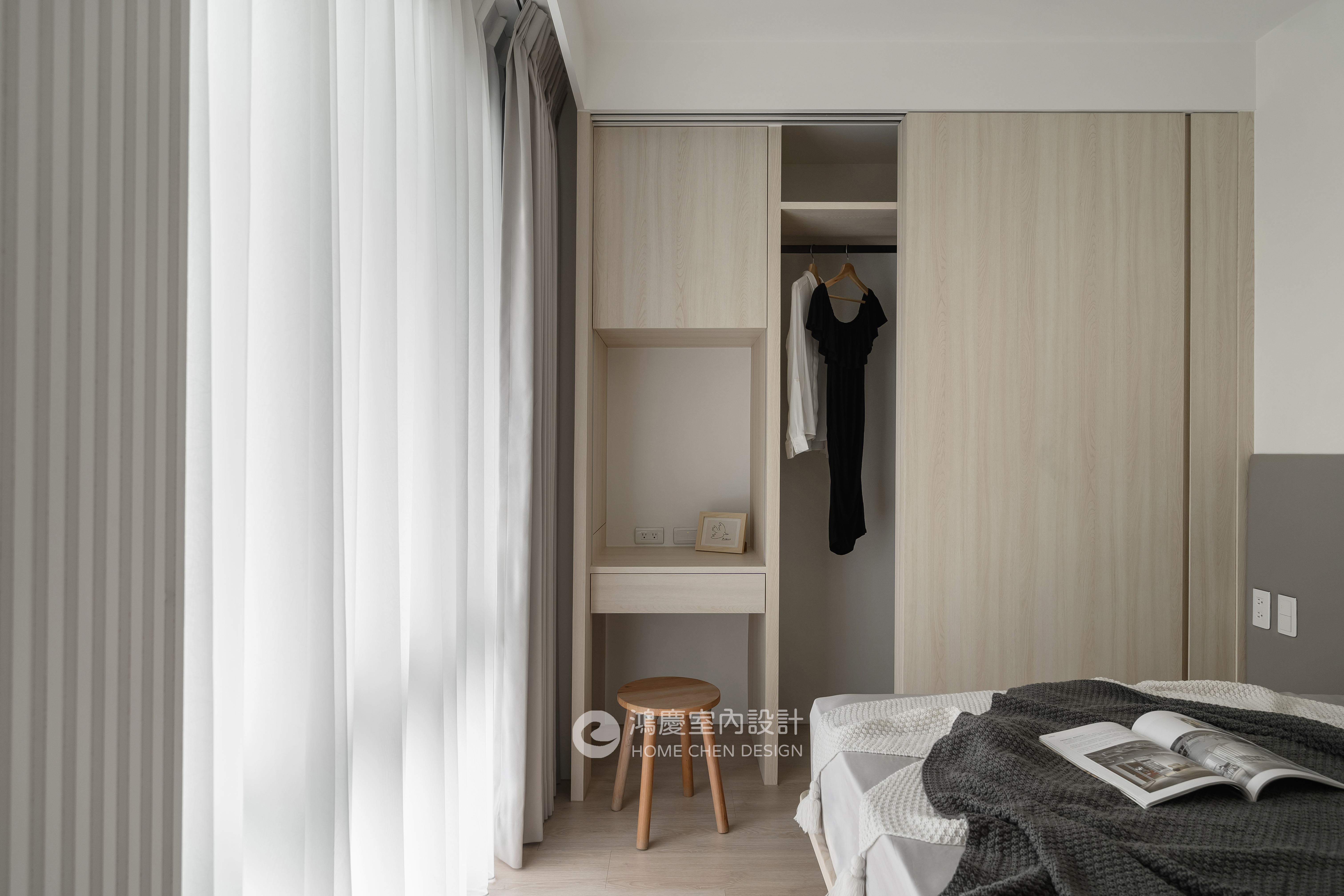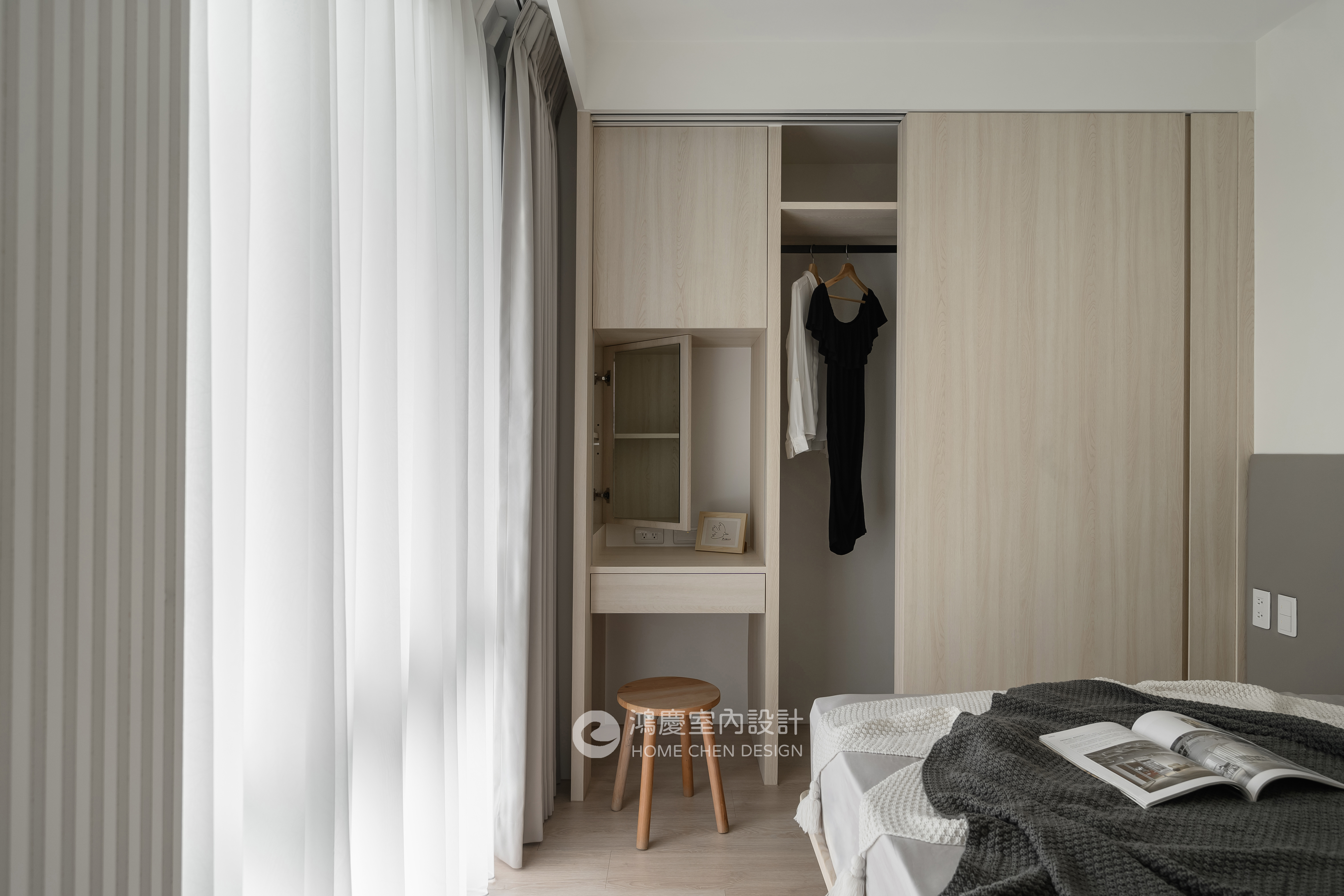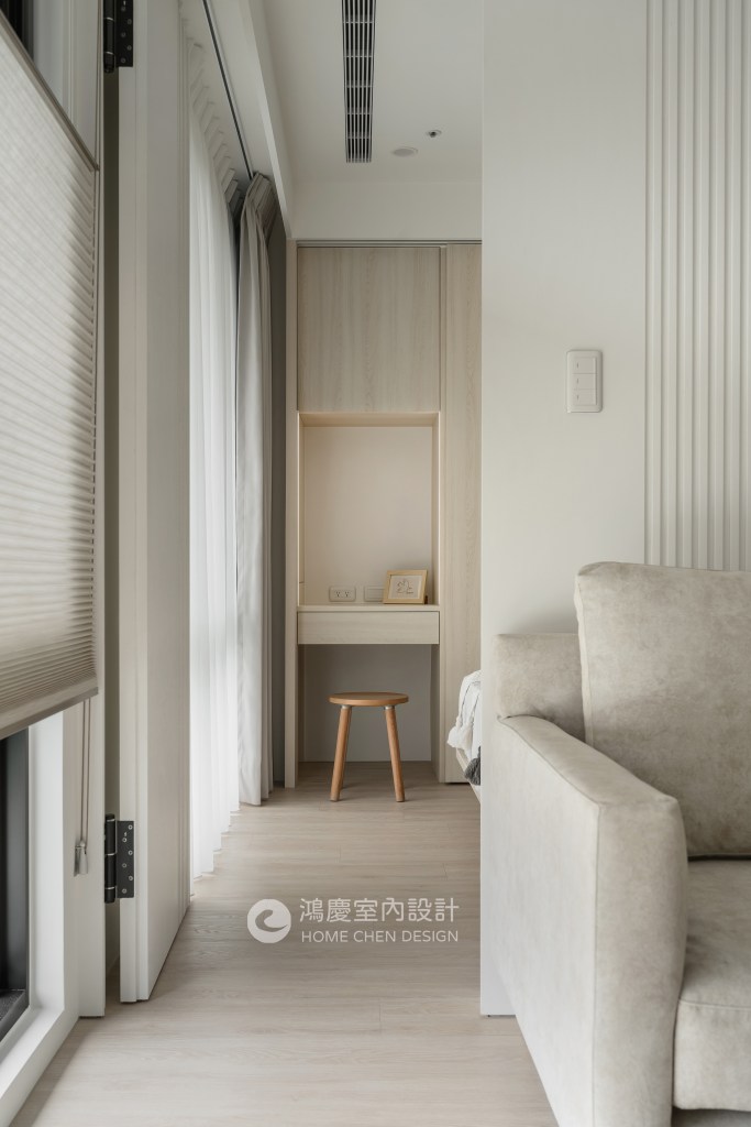 隱藏式化妝台的設計能夠讓床尾空間更加的一體化,使用拉門衣櫃門將化妝桌包覆在內。