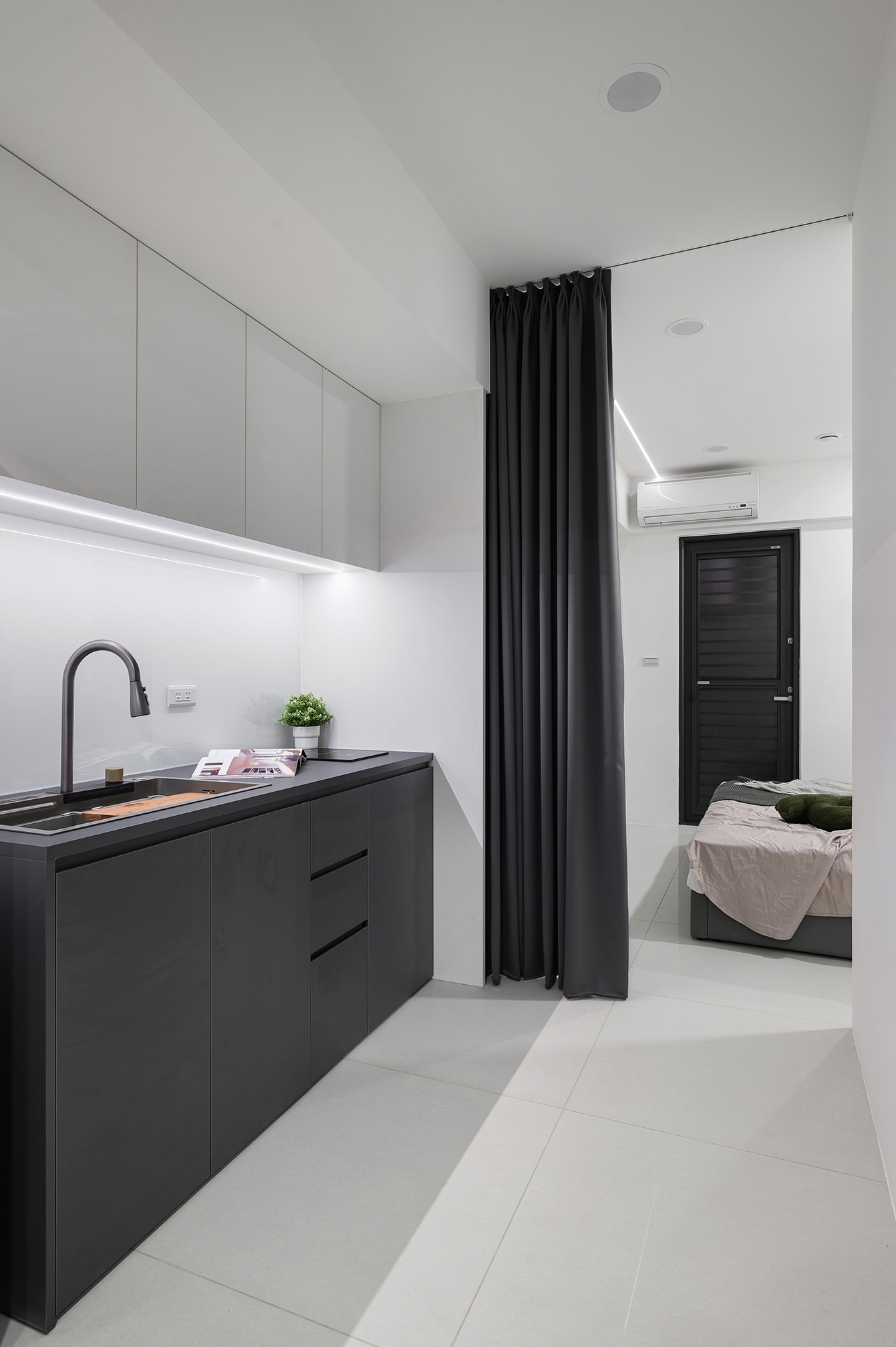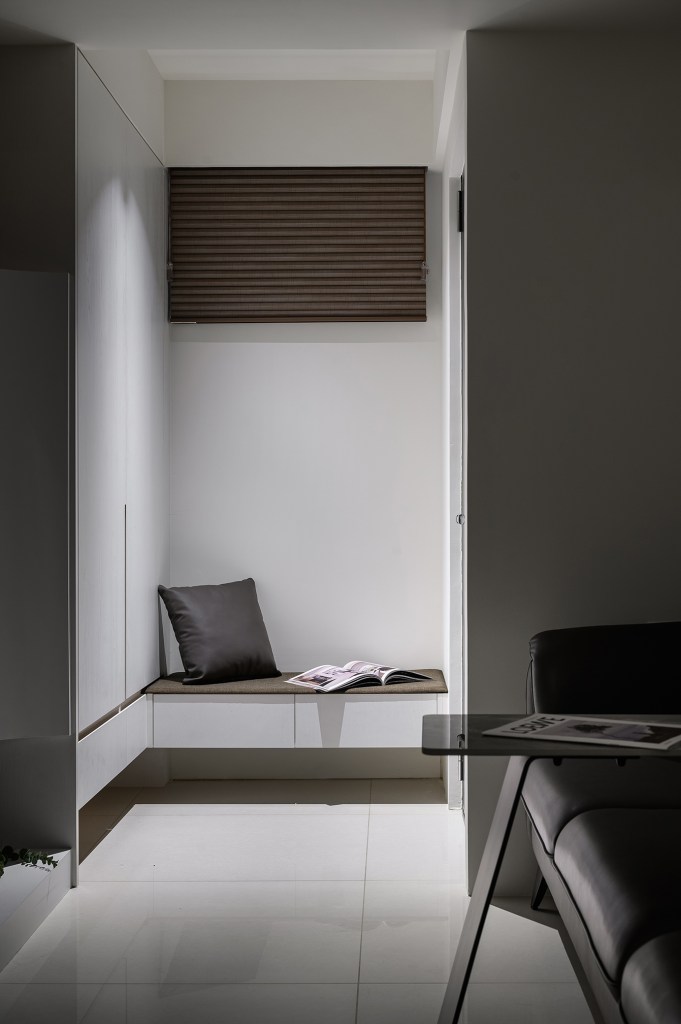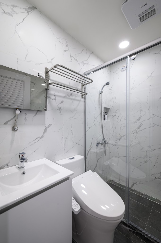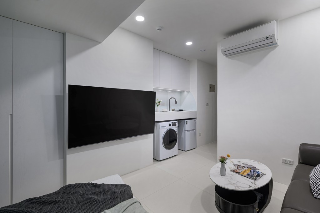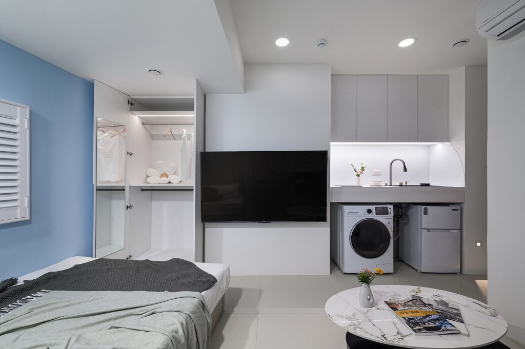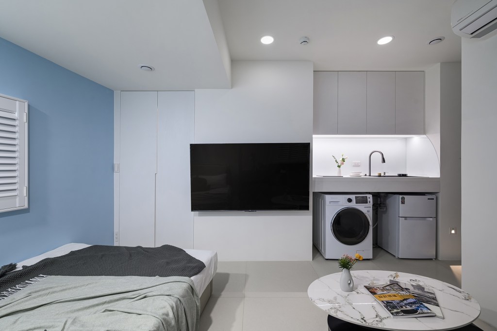 為了有效利用空間,創造出小坪數的多重機能,除了進行訂製系統櫃和家具、家電的採購,以使整體風格更加統一性。在建材的挑選上,特別注重細節,浴室牆面使用大尺寸磁磚,減少縫隙,進一步放大空間感。同時搭配暖風機,讓冬天洗澡更加暖和。地板則選用拋光石英磚,方便清潔保養。最貼心的設計是房內感應式小夜燈,使半夜上廁所更加安心。而開放式廚房讓居住者可以偶爾下廚,流理台上的烤漆玻璃防濺板,在享受美食後也能方便清理。