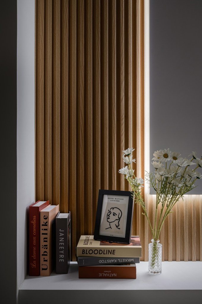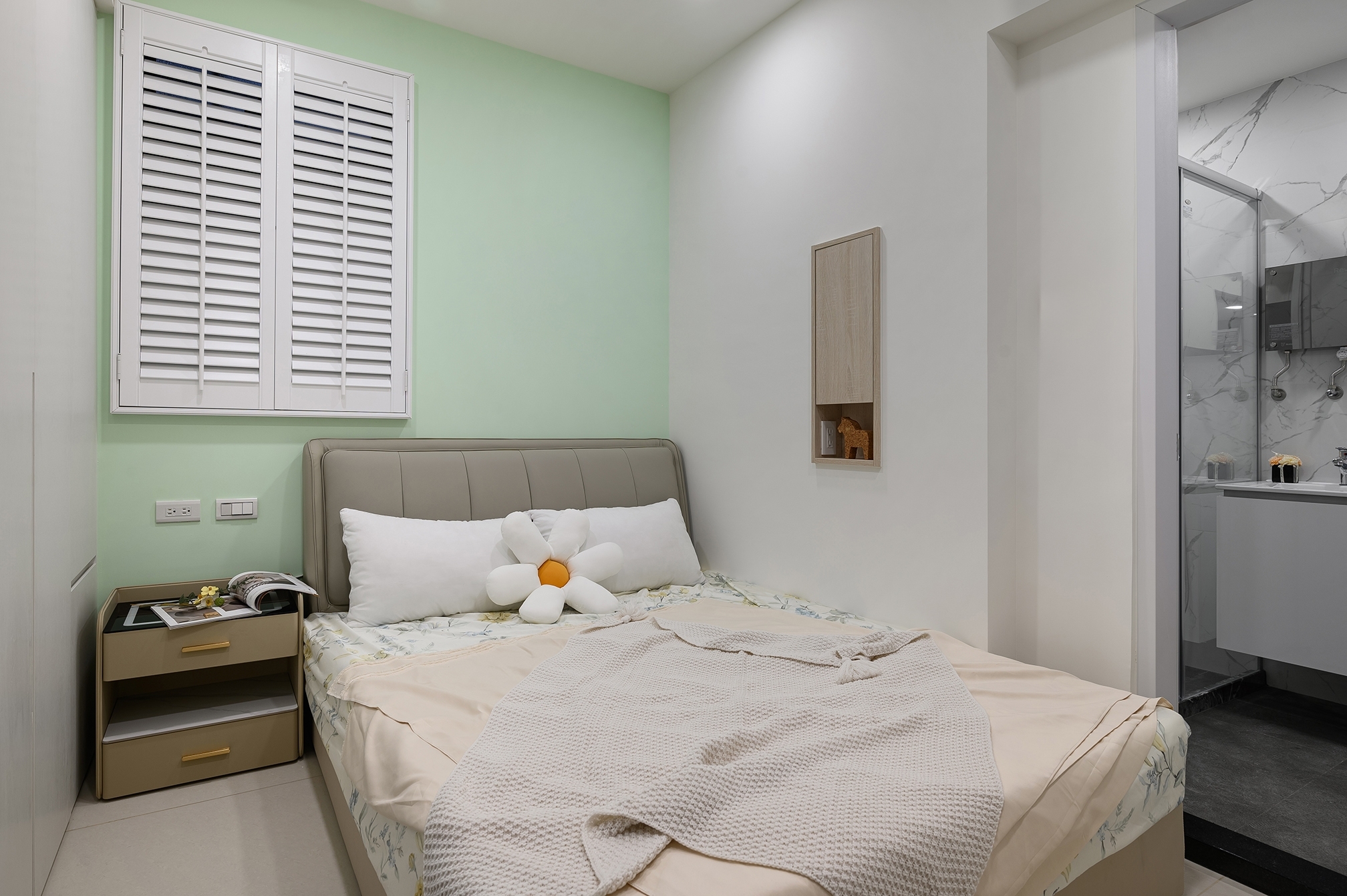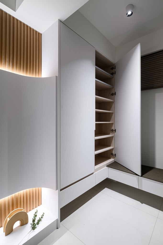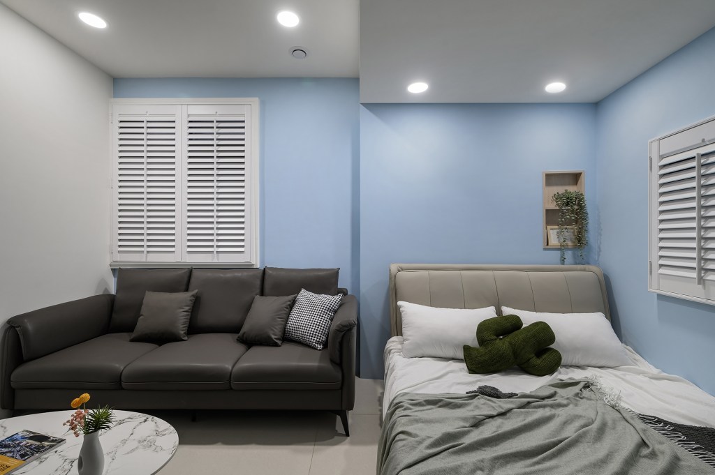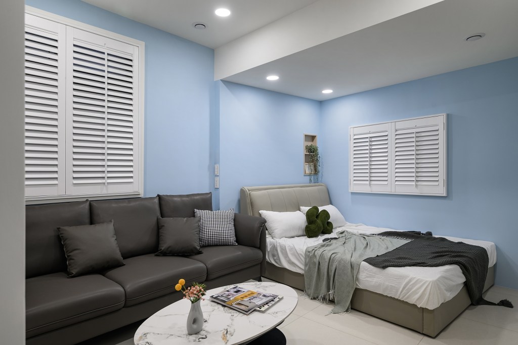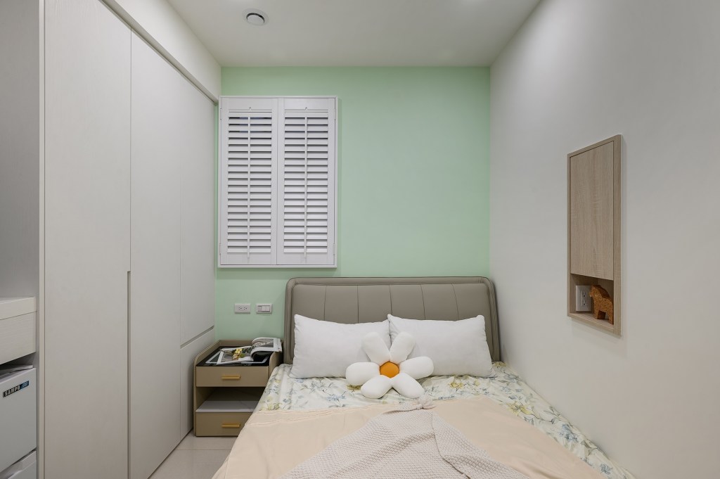 想為每間房間賦予獨特主題,最大的套房作為一房一廳的格局,在玄關處的門後畸零空間,打造了一個穿鞋椅和懸浮式汙衣櫃及鞋櫃。客廳的電視牆以木隔柵板為底,搭配弧形收邊壁板,使細窄型的小客廳更具延伸感。另外兩間房的主牆則以淡綠和淡藍進行跳色處理,融入美式風格的白色木百葉窗,營造更舒適和放鬆的氛圍。