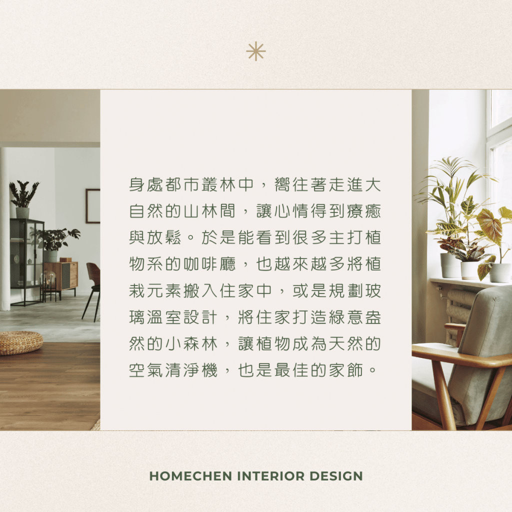 身處都市叢林中,嚮往著走進大自然的山林間,讓心情得到療癒與放鬆。於是能看到很多主打植物系的咖啡廳,也越來越多將植栽元素搬入住家中,或是規劃玻璃溫室設計,將住家打造綠意盎然的小森林,讓植物成為天然的空氣清淨機,也是最佳的家飾。
