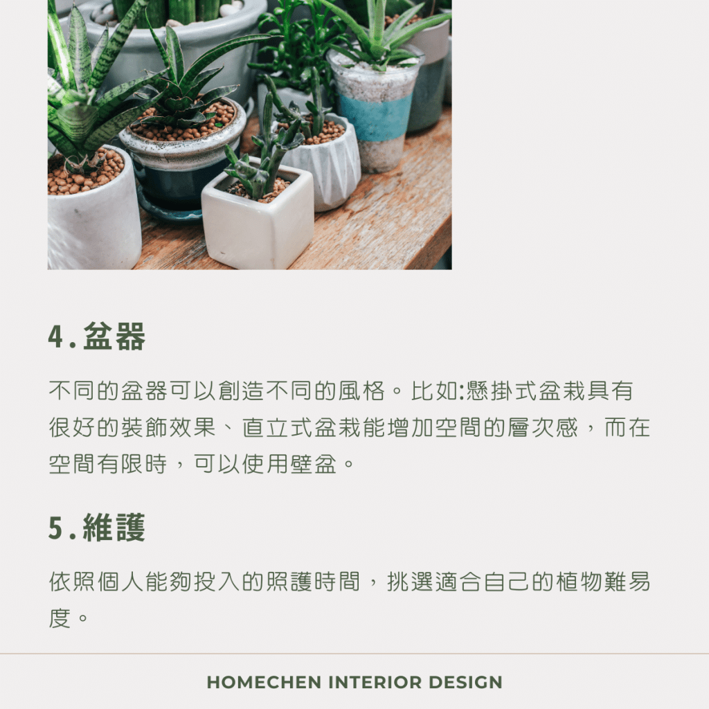 不同的盆器可以創造不同的風格。比如:懸掛式盆栽具有很好的裝飾效果、直立式盆栽能增加空間的層次感,而在空間有限時,可以使用壁盆。