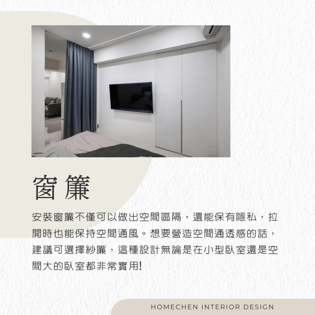 安裝窗簾不僅可以做出空間區隔,還能保有隱私,拉開時也能保持空間通風。想要營造空間通透感的話,建議可選擇紗簾,這種設計無論是在小型臥室還是空間大的臥室都非常實用!